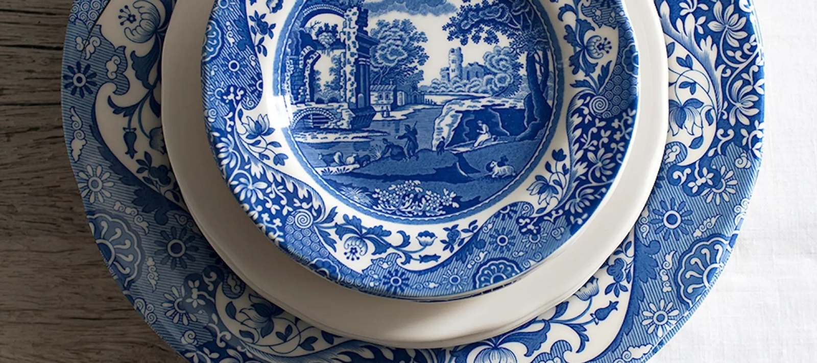 I Spode sine vakre serier finner du alt fra tekopper, kaffekopper, krus, tallerkener, tekanner, melkekanner, eggeglass, smørbrødbrett, ovnsvotter, forklær og mye mer. Du kan helt enkelt invitere hjem til et tidløst dekket bord. Mønsteret og designet er lett å like. Blikket fanges lett av mønsteret og oppdager hver gang nye bilder og historier som gjemmer seg der.