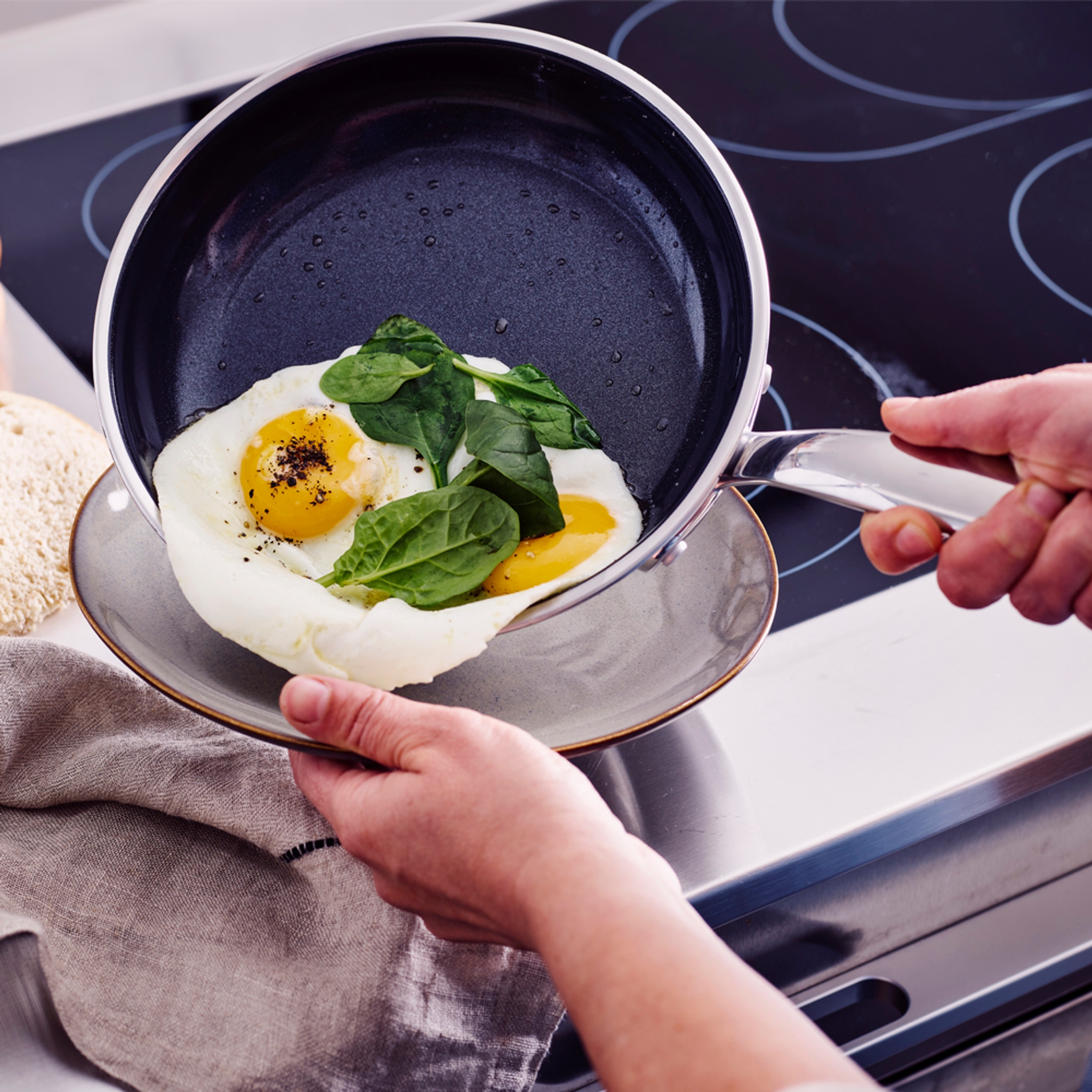 Keramisk non-stick belegg (Thermolon™ Diamond) - uten tilsatt PFAS- for ultimat holdbarhet og riperesistenthet. Elegant og ergonomisk håndtak i rustfritt stål med en ultramatt finish. Ekstremt holdbar konstruksjon av ultramatt 3-lags rustfritt stål med aluminiumskjerne. Fordeler varmen raskt og jevnt på alle koketopper, for resultat på et høyt nivå. Også ovnssikker for økt allsidighet. Det keramiske non-stick belegget Thermolon krever mindre olje eller smør, er enkel å rengjøre og tåler maskinvask.