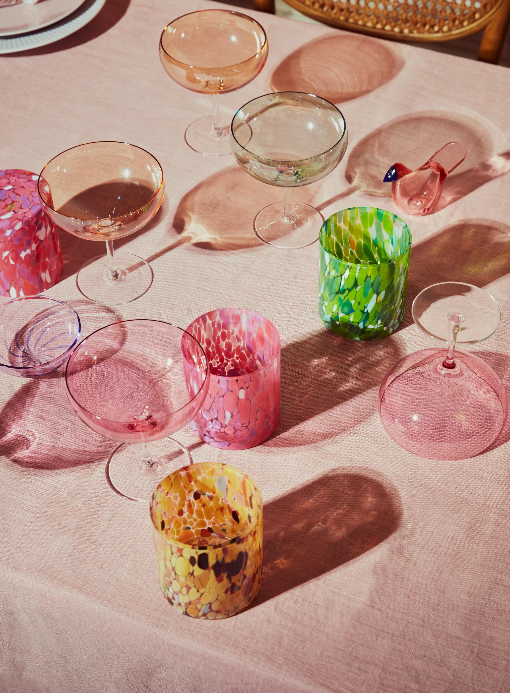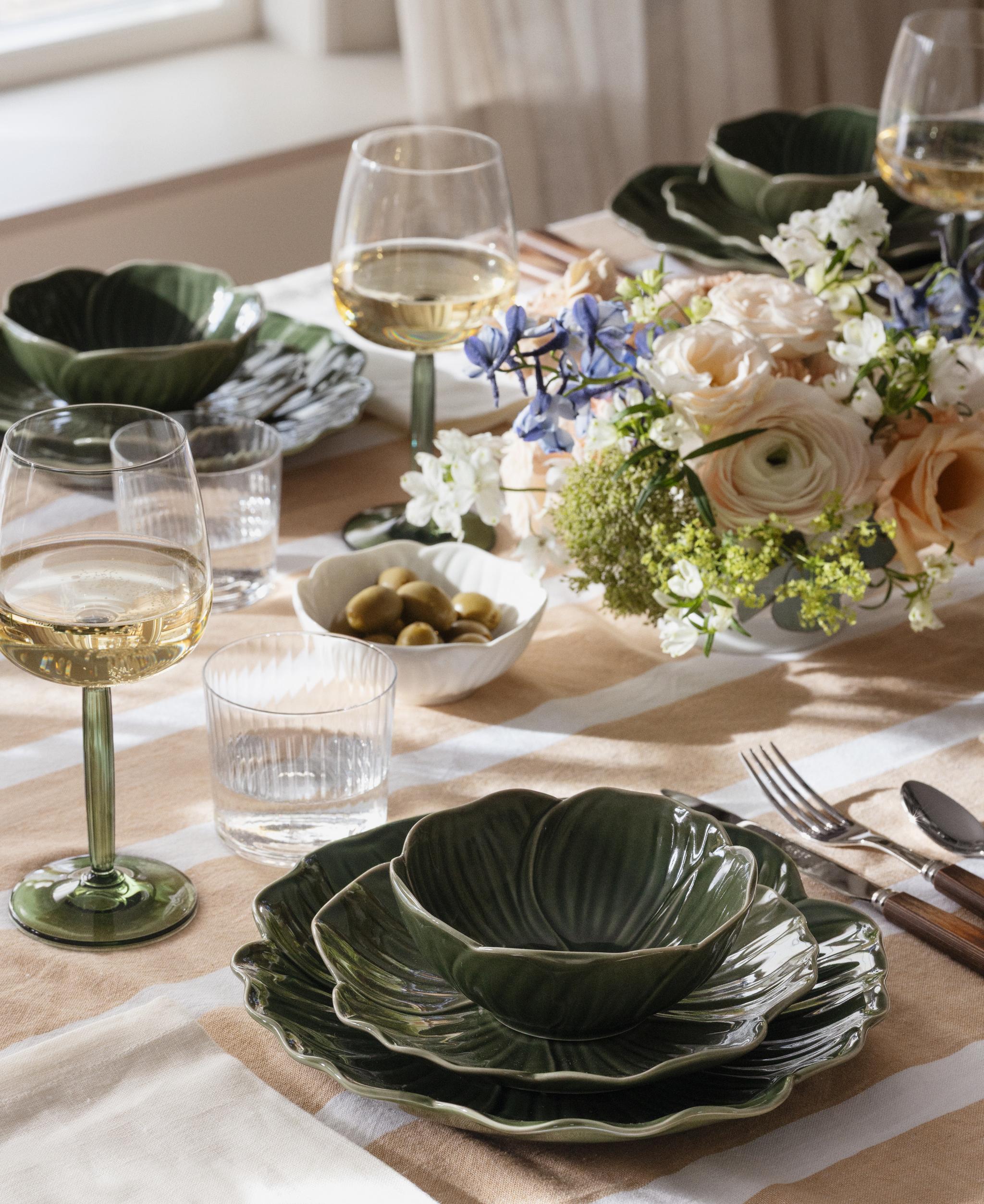 Apropos å tenke utenfor de tradisjonelle borddekkingsreglene - hvorfor ikke også utforske og eksperimentere på glassfronten? I mange sesonger har de transparente glassene vært i fokus. Nå er det imidlertid på høy tid at glass i alle regnbuens farger finner veien inn på det dekkede bordet. Hva med vannglass i en havblå nyanse, rogivende grønn eller trendy lyslilla? Et fargerikt drikkeglass i kombinasjon med et mer klassisk vinglass på stett i transparent glass tar middagsopplevelsen til et nytt nivå!