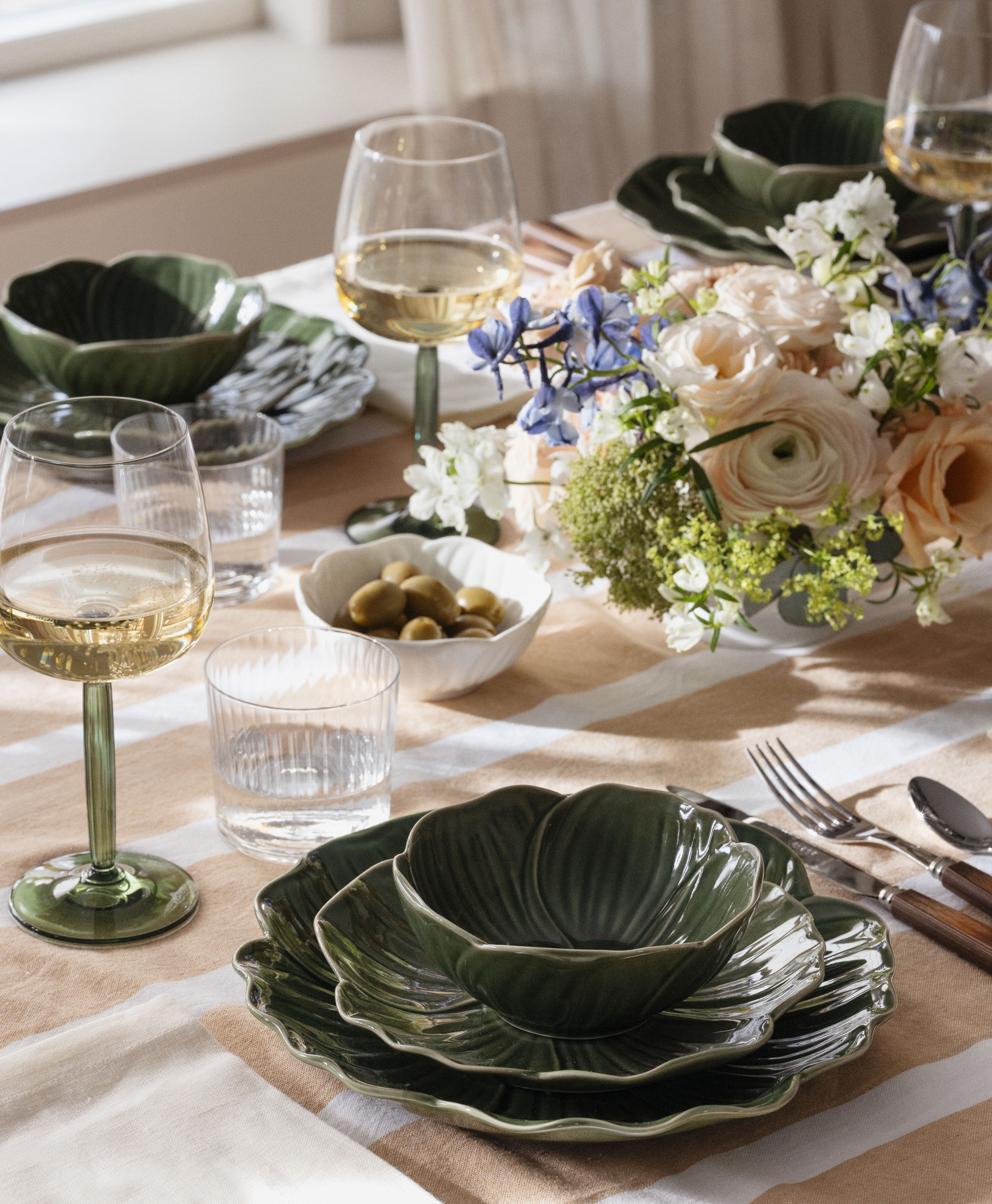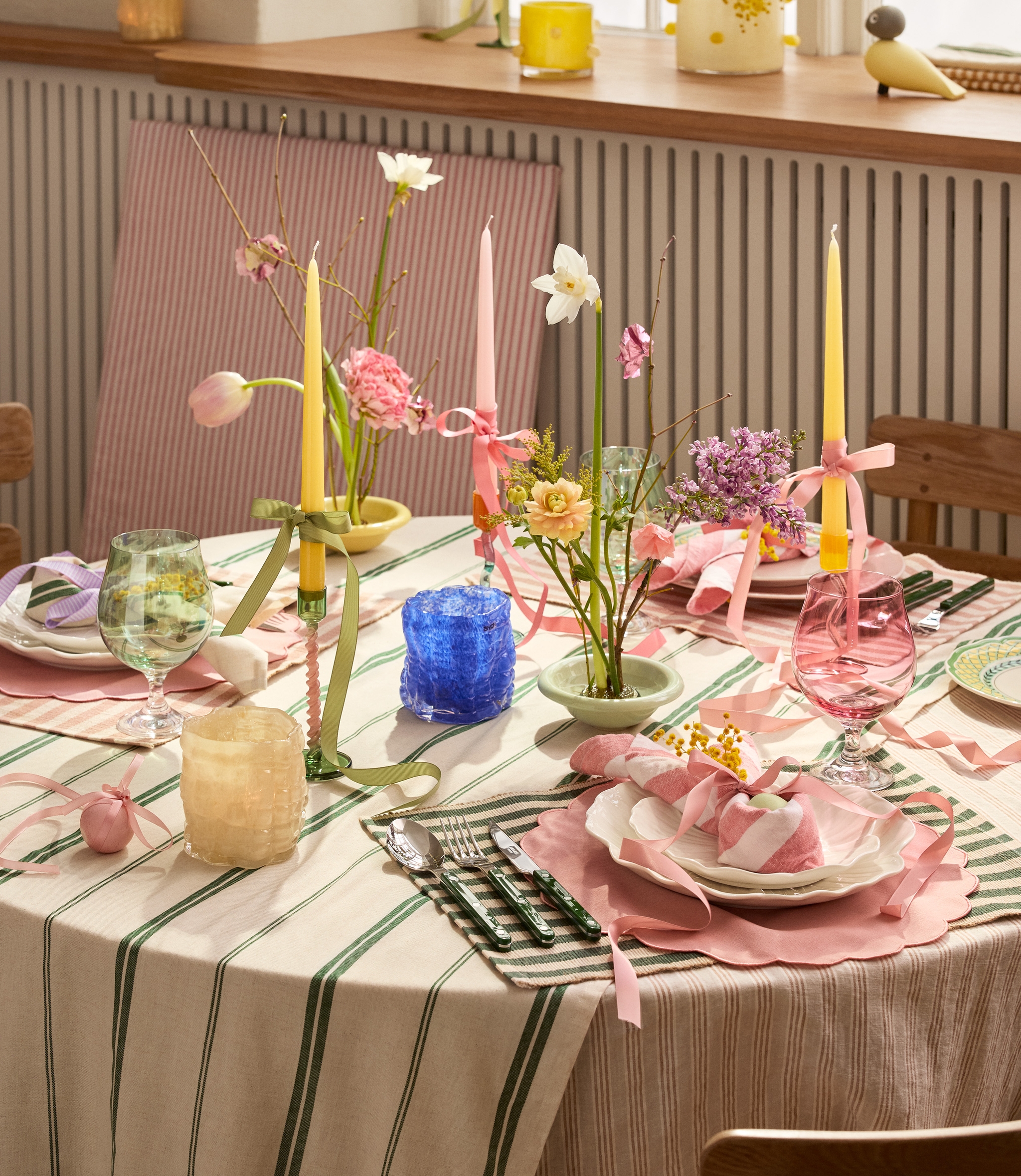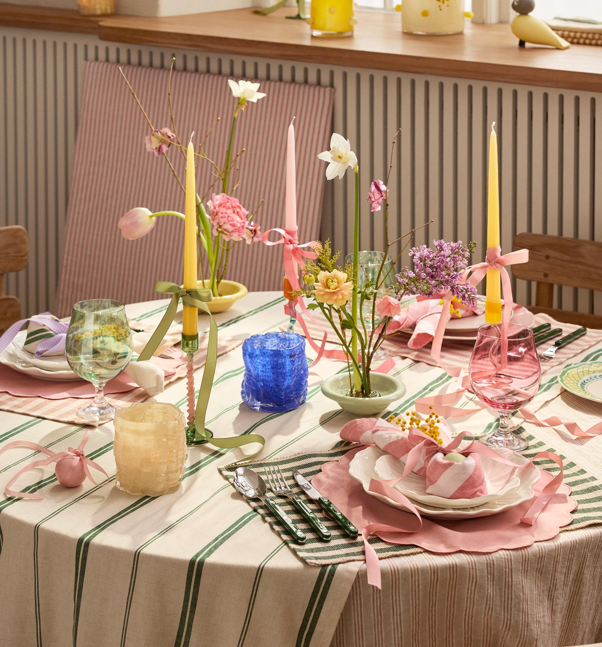 Vårens borddekking er alt annet enn beskjeden, der miks og match (eller mismatch!) er det absolutte stikkordet. Vi tør å blande herlige vårfarger med dristige mønster eller former som skiller seg ut, for å skape en varierende borddekking med karakter. Tenk utenfor de tradisjonelle borddekkingsrammene. Legg for eksempel til bestikk i en nyanse eller finish som popper, uventede fargerike servietter eller dekorer med vårlige snittblomster som et symbol for vårens fruktbarhet. La borddekkingen ta for seg og inviter til en dundrende vårmiddag, som få kommer til å glemme!