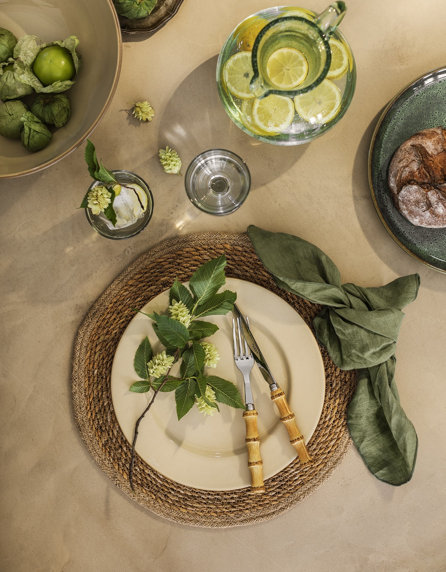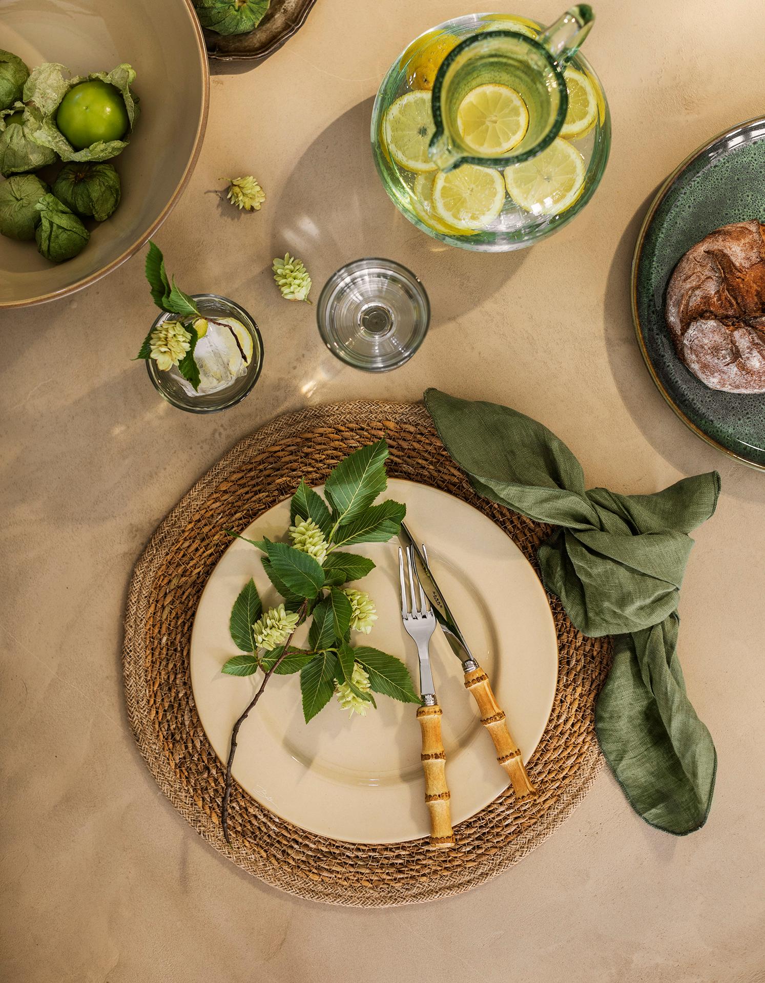 Dekk på i naturens farger og hvorfor ikke bruke en sterk grønnfarge som aksent, på porselenet for eksempel, som matches med innslag i tre, lin og strå. Tenk at du skal være i ett med naturen når du dekker bordet.