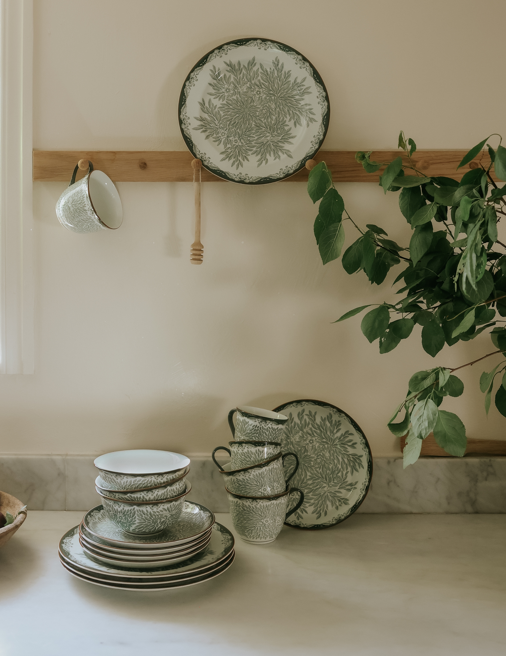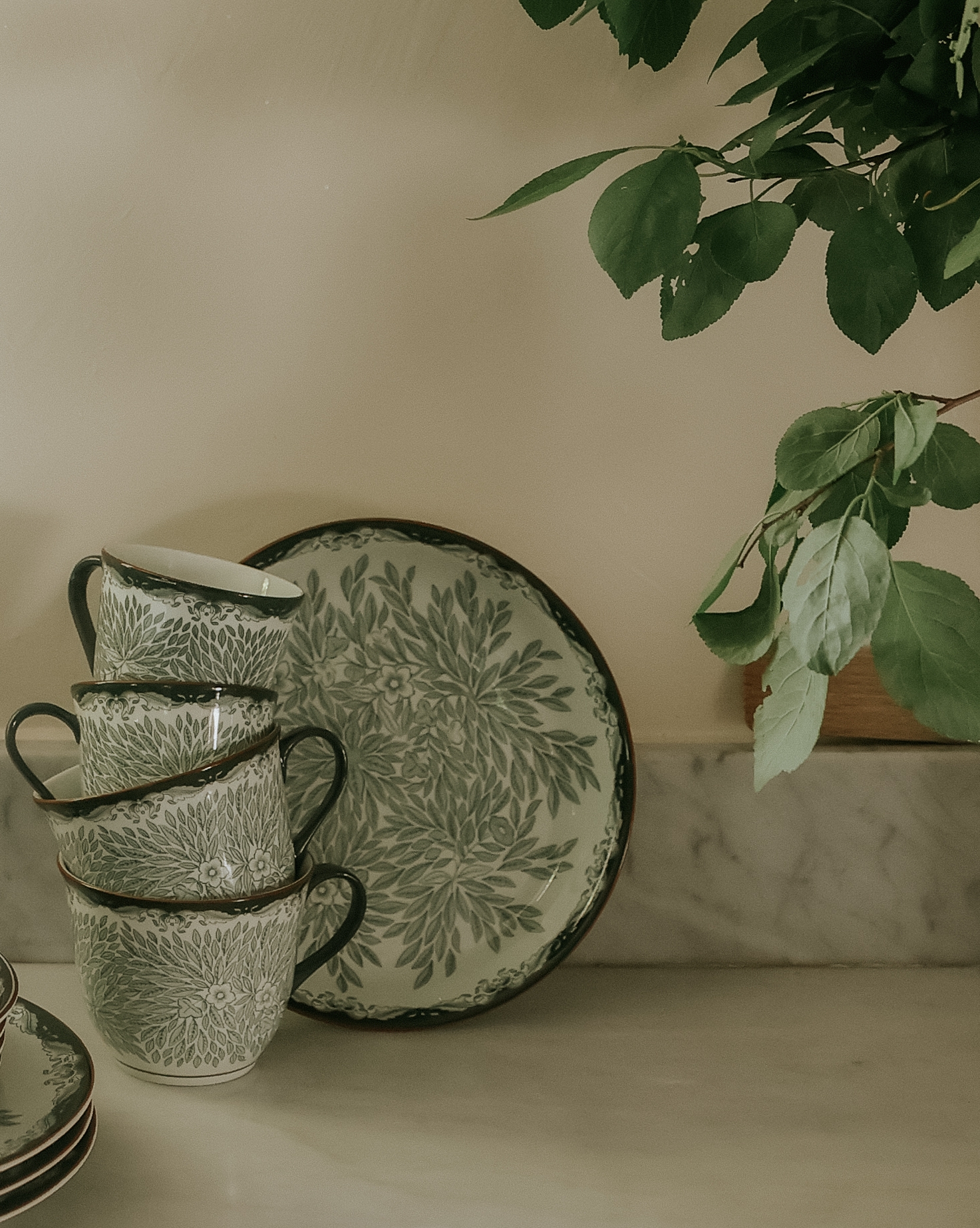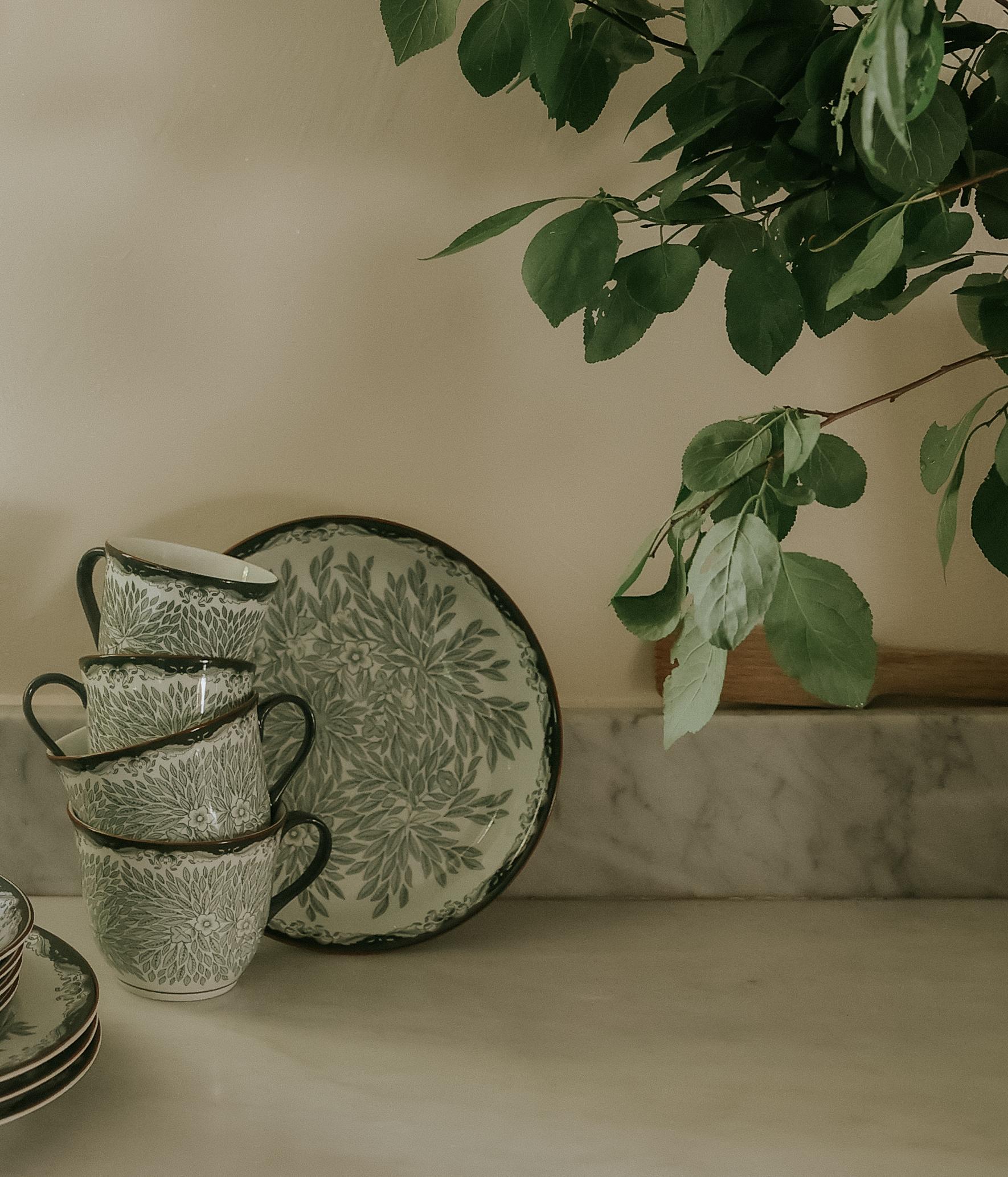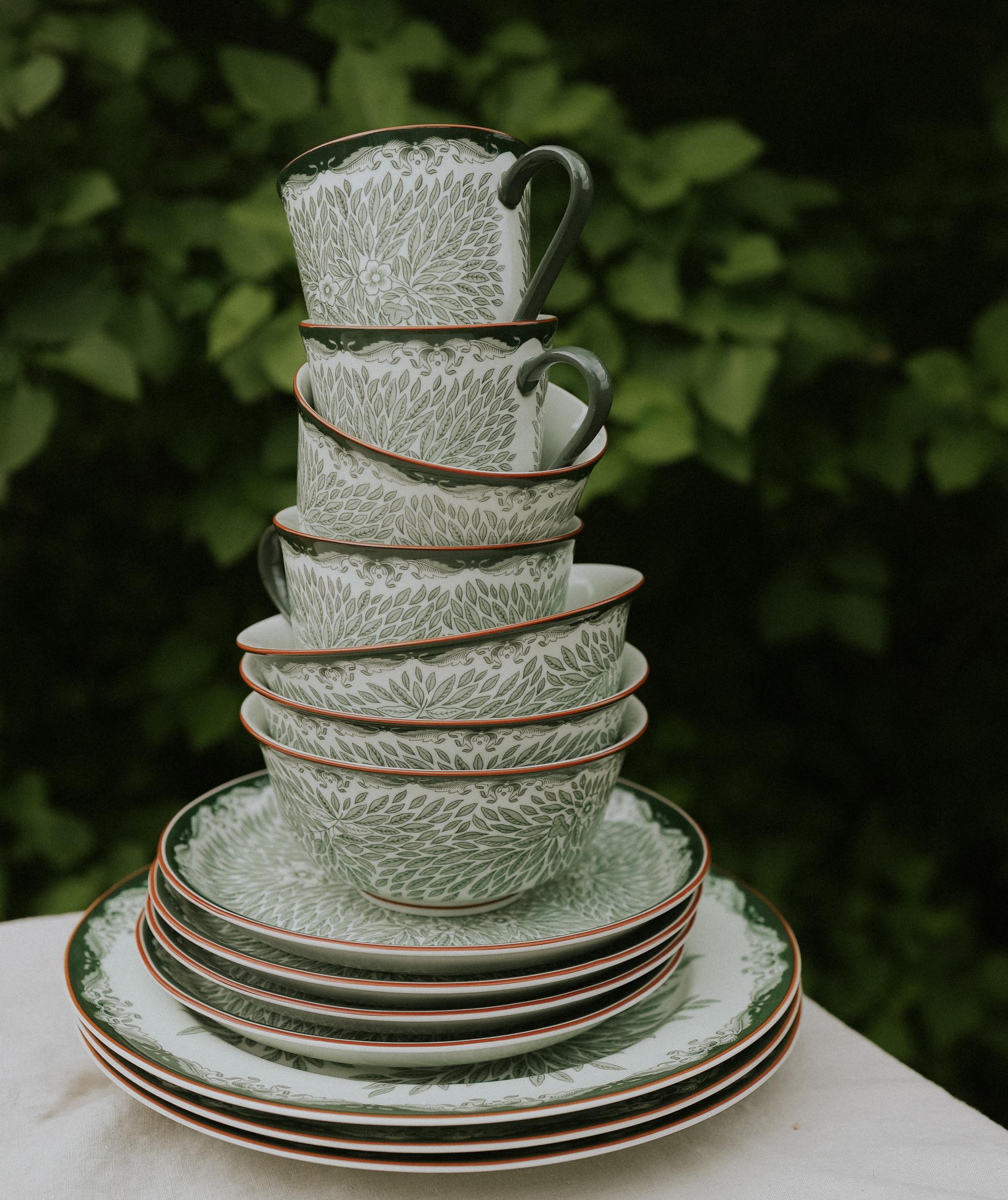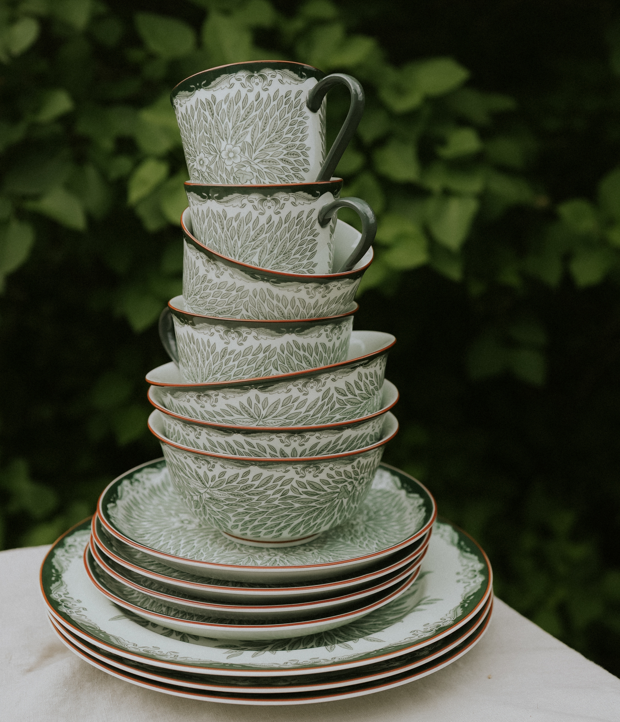 Nå utvides Ostindia Floris-serien med en fortryllende grønn farge som er utrolig allsidig. Enten du ønsker å skape en elegant borddekking eller servere en enkel frokost, passer Ostindia Floris grønn perfekt med sitt vakre mønster av tett grønt bladverk som gir en følelse av hverdagsluksus til hvert måltid.