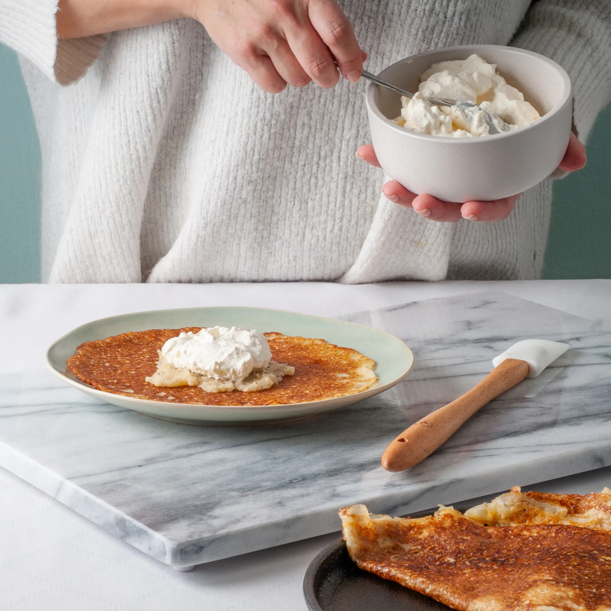 Tips! Ved å tilsette en desiliter kullsyrevann i røren blir de tynne pannekakene dine ekstra sprø og gode!