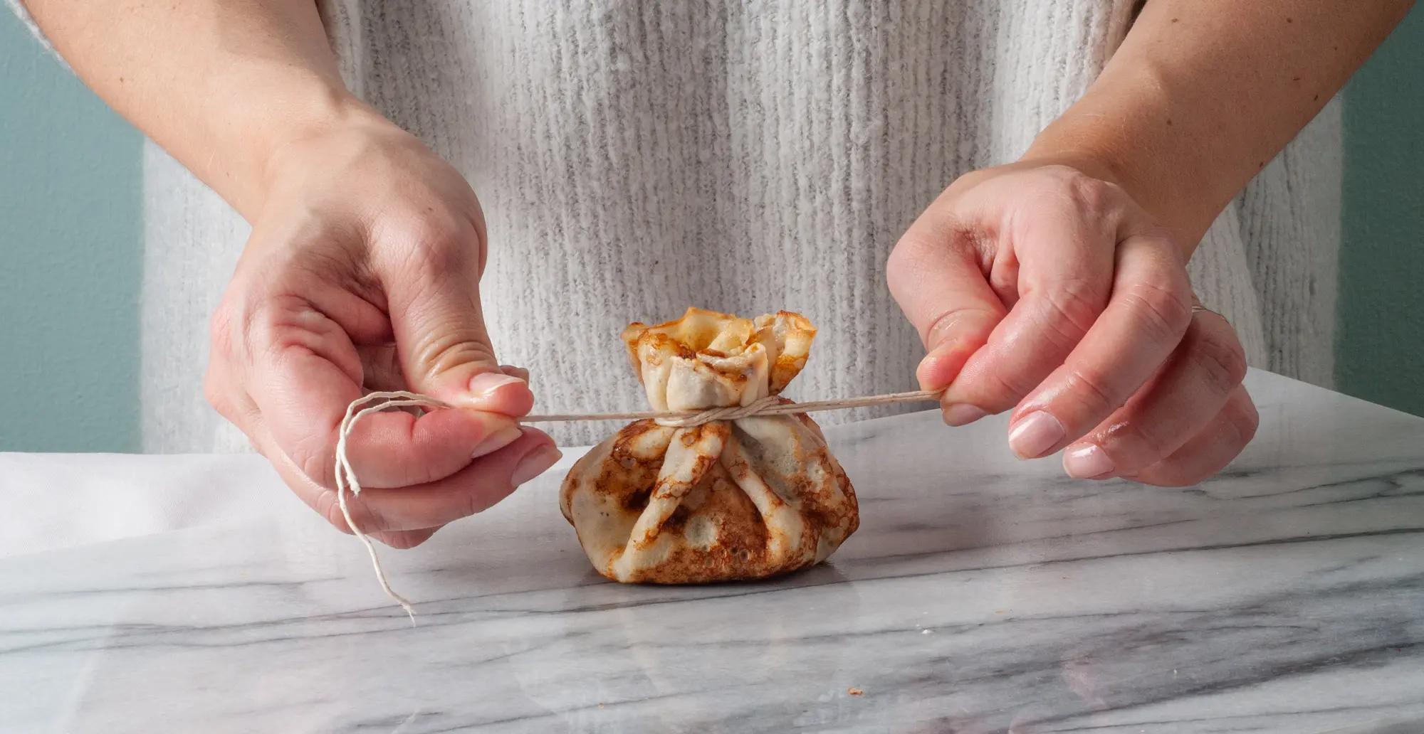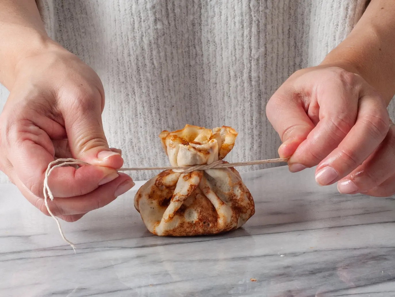 6. Ha mandelmasse og fløte i midten av pannekaken. Samle kantene og knyt pannekaken forsiktig til en knute. Dryss med melis.