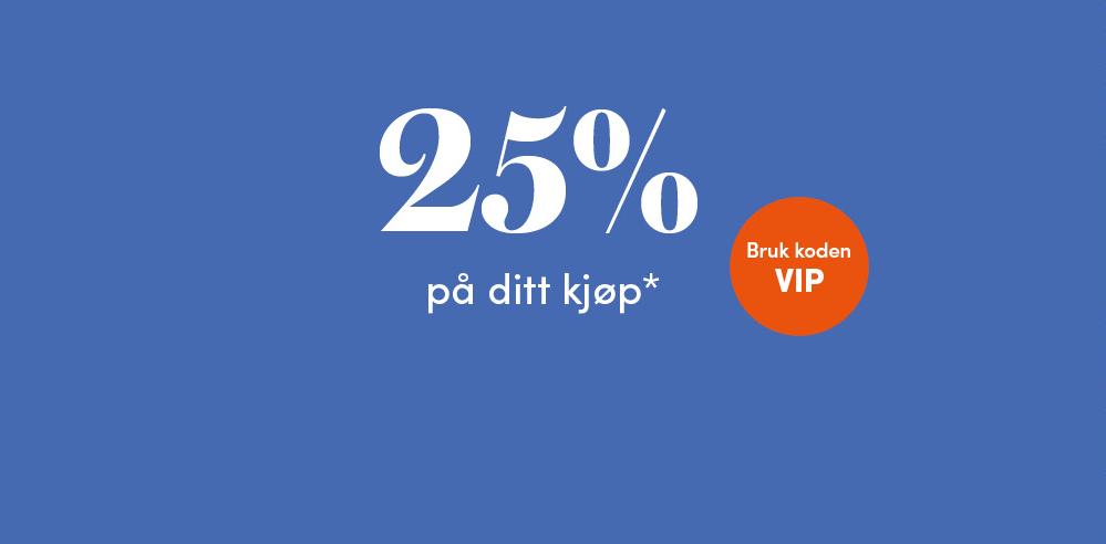 *Gjelder på produkter merket med 25% RABATT. Gjelder ikke på produkter merket med Bra Deal eller på kampanjepriser. Tilbudet kan ikke kombineres med andre rabattkoder eller tilbud.