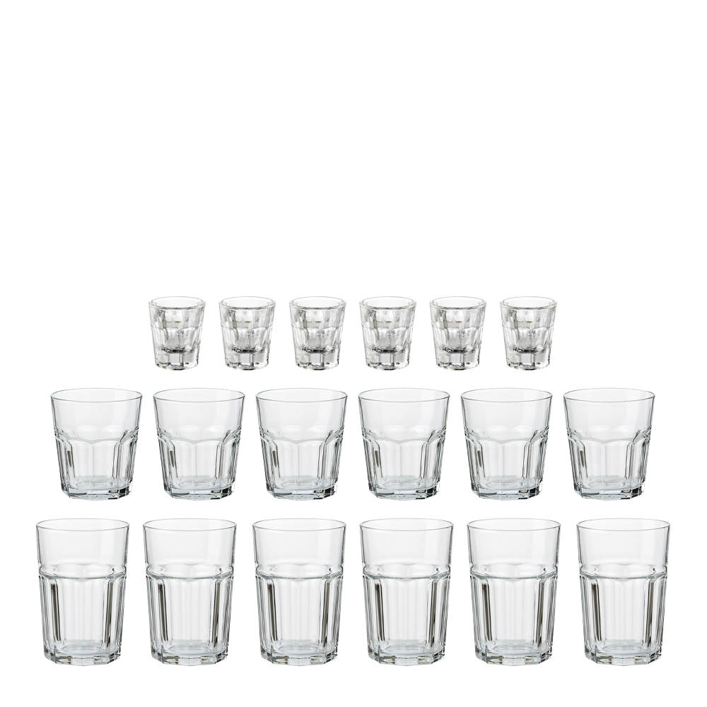 Atelier Granit glassett 18 deler fra Aida er et komplett sett som dekker de fleste behov – både til hverdags og når du har gjester. Med 6 store glass, 6 mindre glass og 6 shotglass får du en praktisk og allsidig samling med moderne preg. Designet er balansert og funksjonelt, med god vekt og behagelig grep.