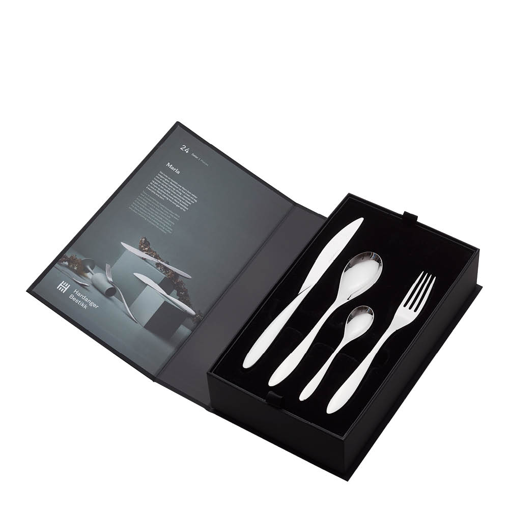 Bestikksett for 6 personer fra Hardanger Bestikks serie Maria. Bestikkserien ble designet i 2014 av Odd Leikvoll, er moderne og stilren og inspirert av bølgenes form når de bryter mot strandkanten. De rene formene passer like godt til hverdags som til fest og har raskt blitt en favoritt blant Hardanger sine serier.