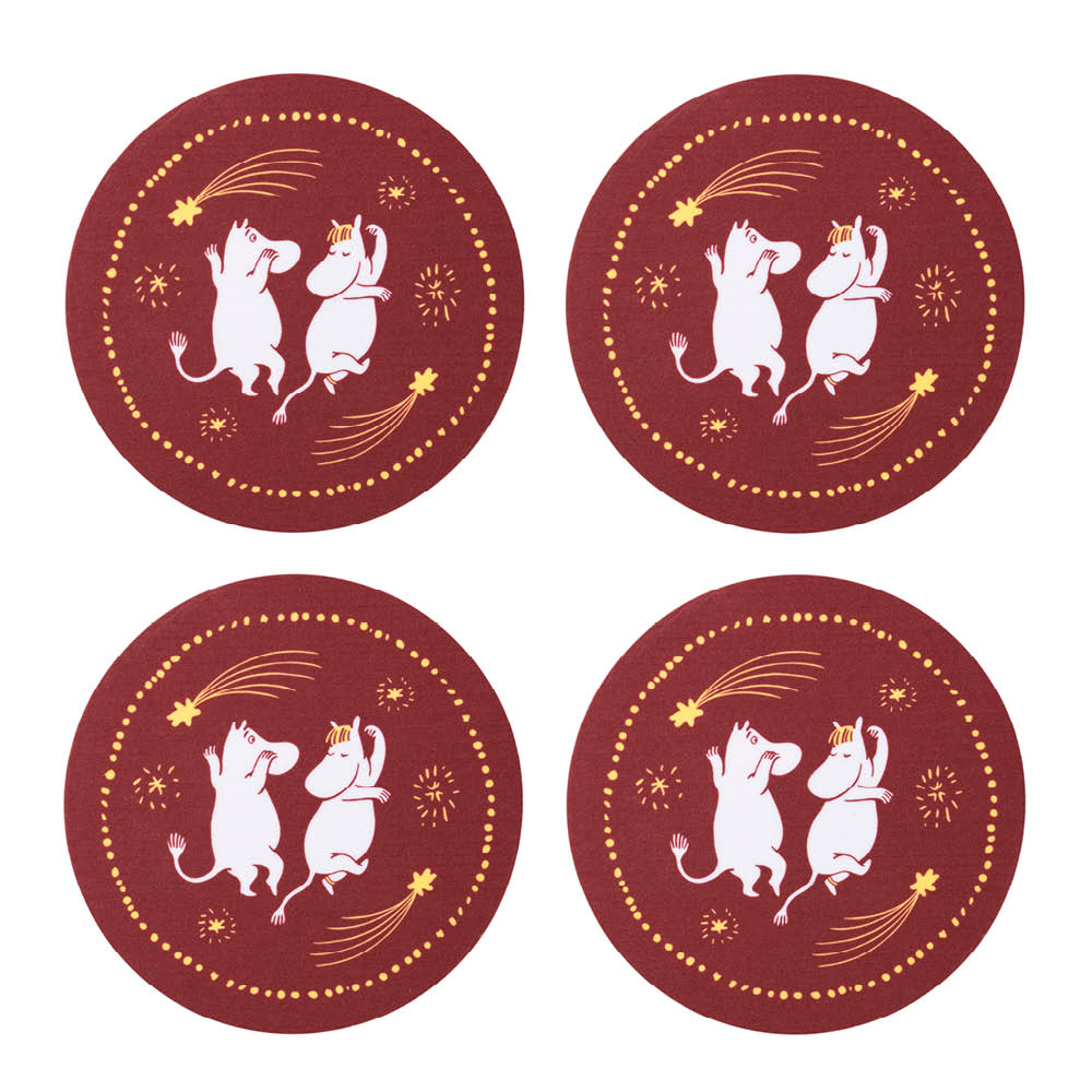MoominArabia Festlige stunder glassunderlag 4 stk er en del av jubileumskolleksjonen som markerer Mummitrollets 80 år. Illustrasjonene er inspirert av en fest i Mummidalen, der alle er invitert og samholdet står i sentrum.