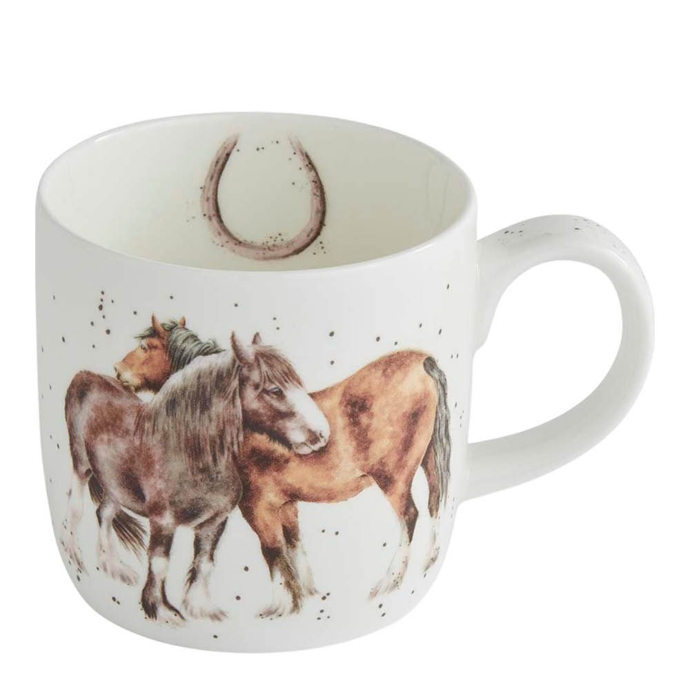 Wrendale Designs Side by Side krus 31 cl hest er et gjennomarbeidet krus i benporselen med illustrasjoner av Hannah Dale. Motivet viser to hester tett sammen på den ene siden, og en hest som observerer en liten høne på den andre, med en hestesko som dekor på innsiden for en helhetlig detalj.