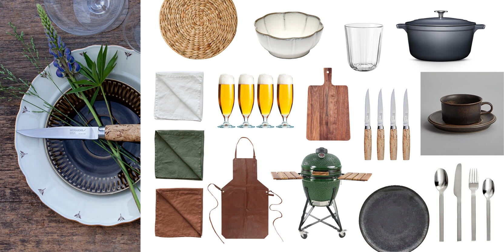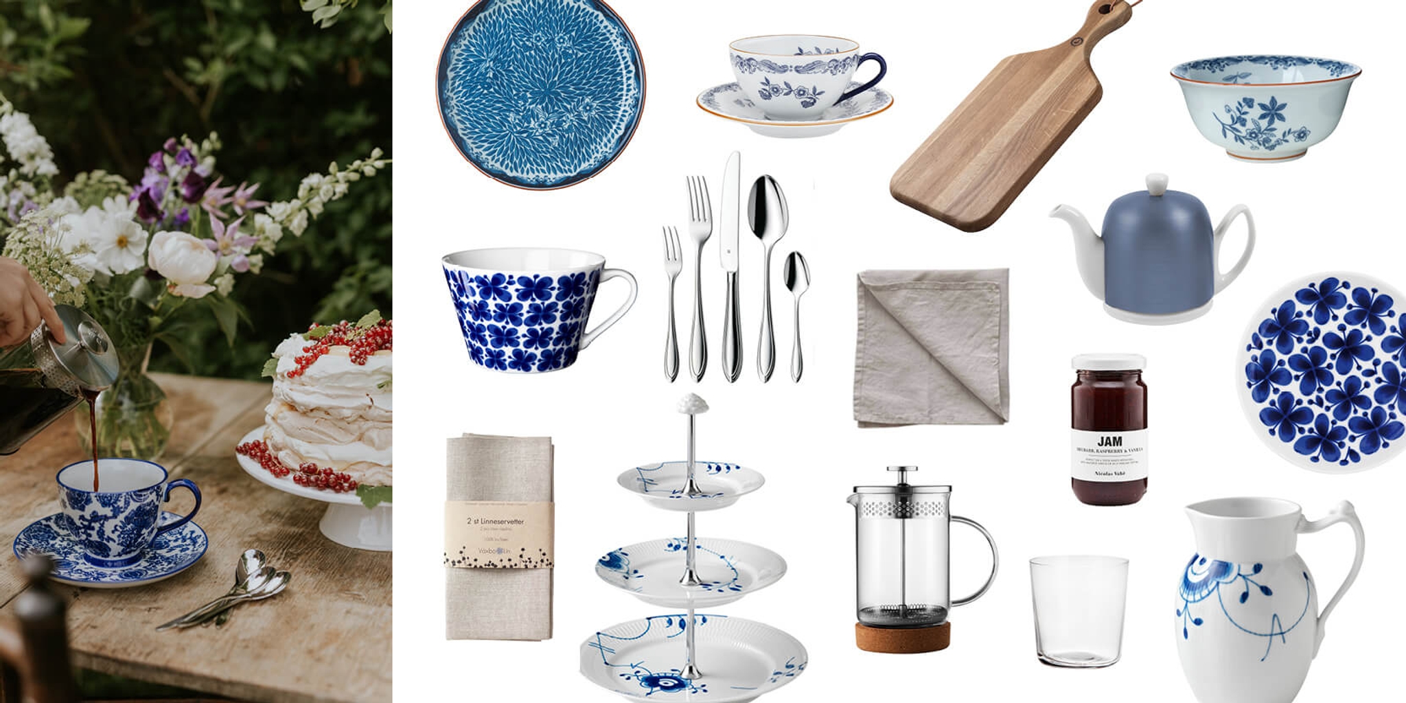 Hva er ikke mer sommerlig enn det blå-hvite serviset? Dekk opp til en klassisk romantisk borddekking der du jobber inn naturmaterialer som lin og tre, i for eksempel duker og servietter. Hva med å servere nybakte kanelboller rett fra et fint skjærebrett? Og når du vil slo på stortrommen - by på en sommerlig jordbærkake som skiller seg ut med sin røde farge til det blå-hvite. For en sommerdrøm!